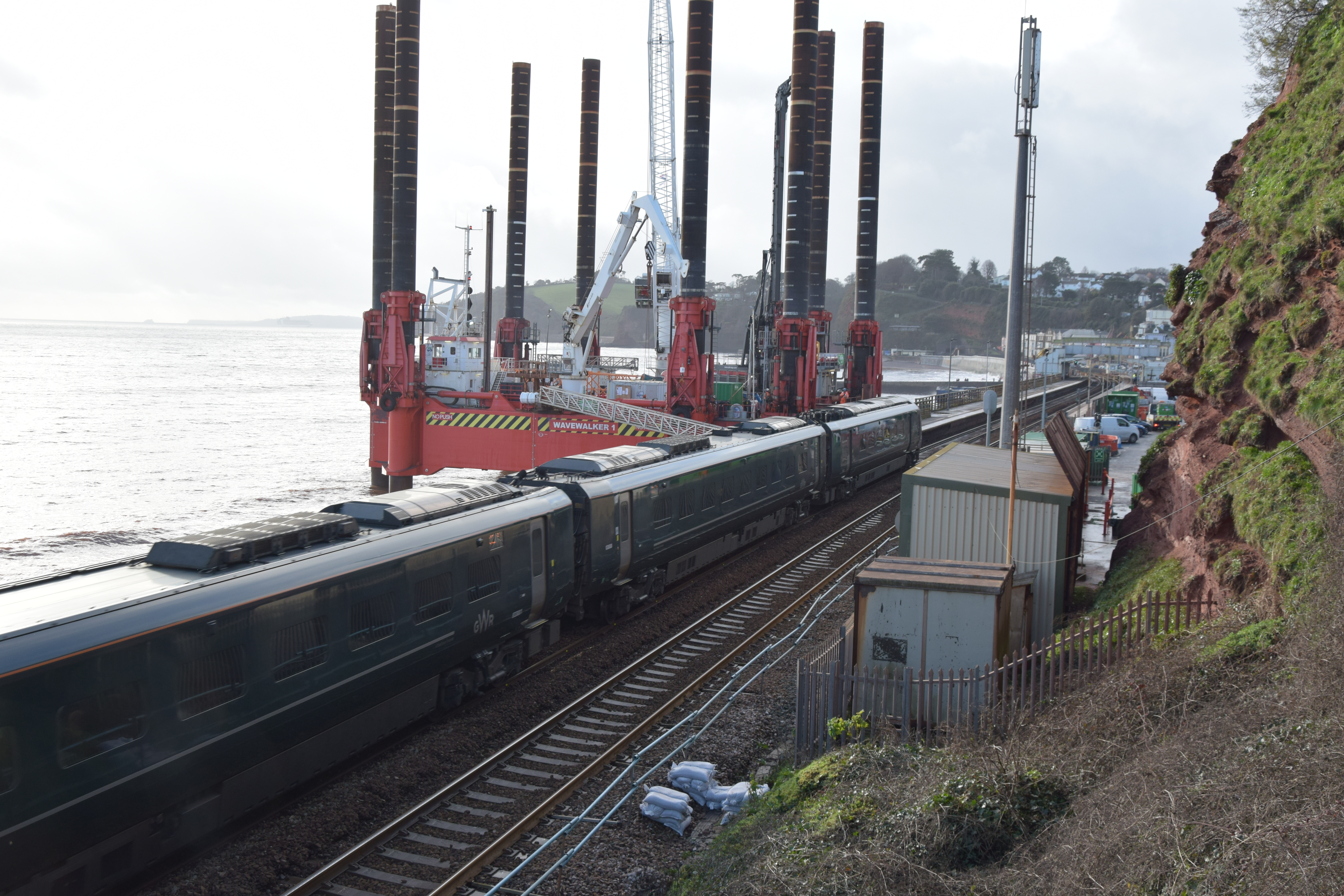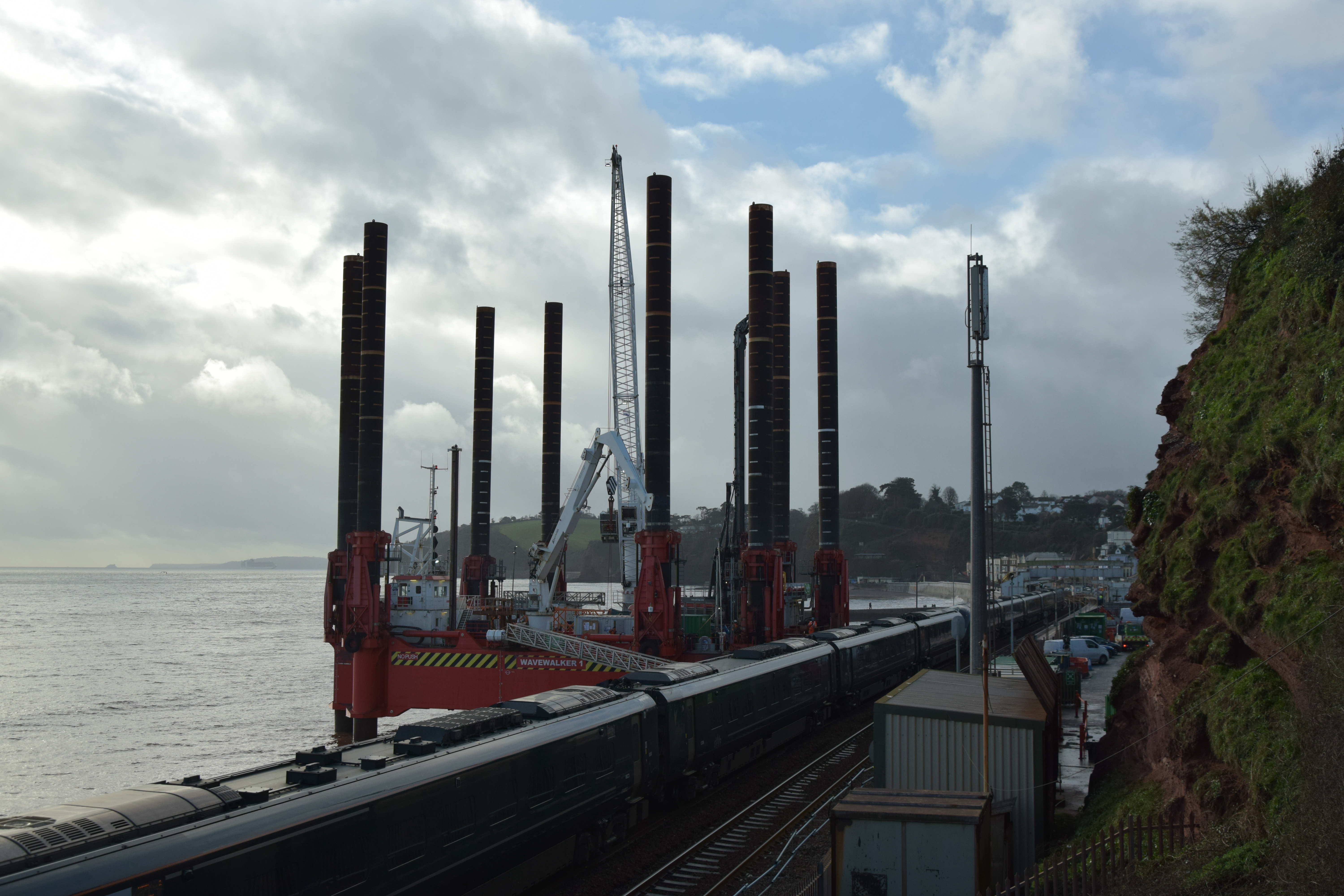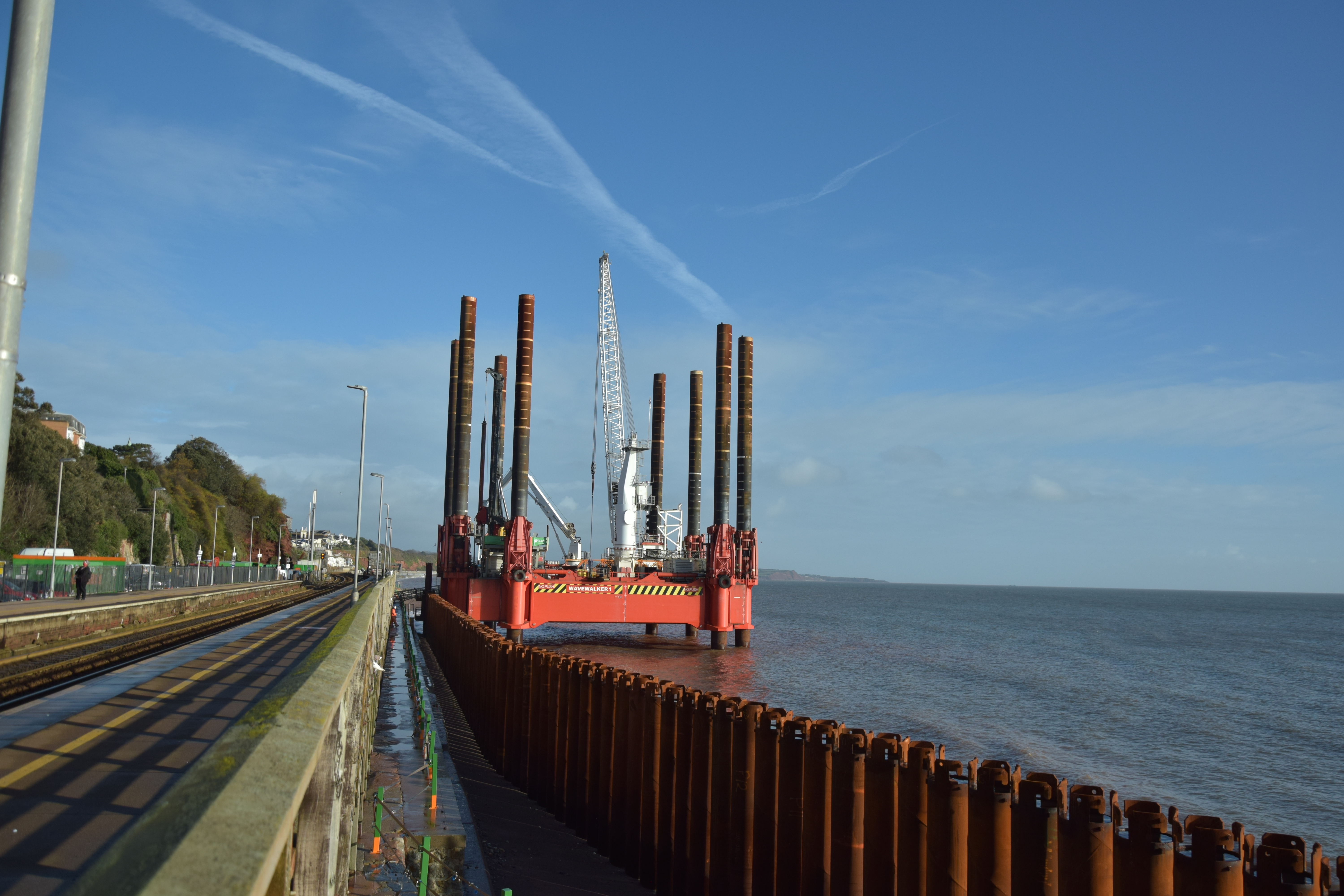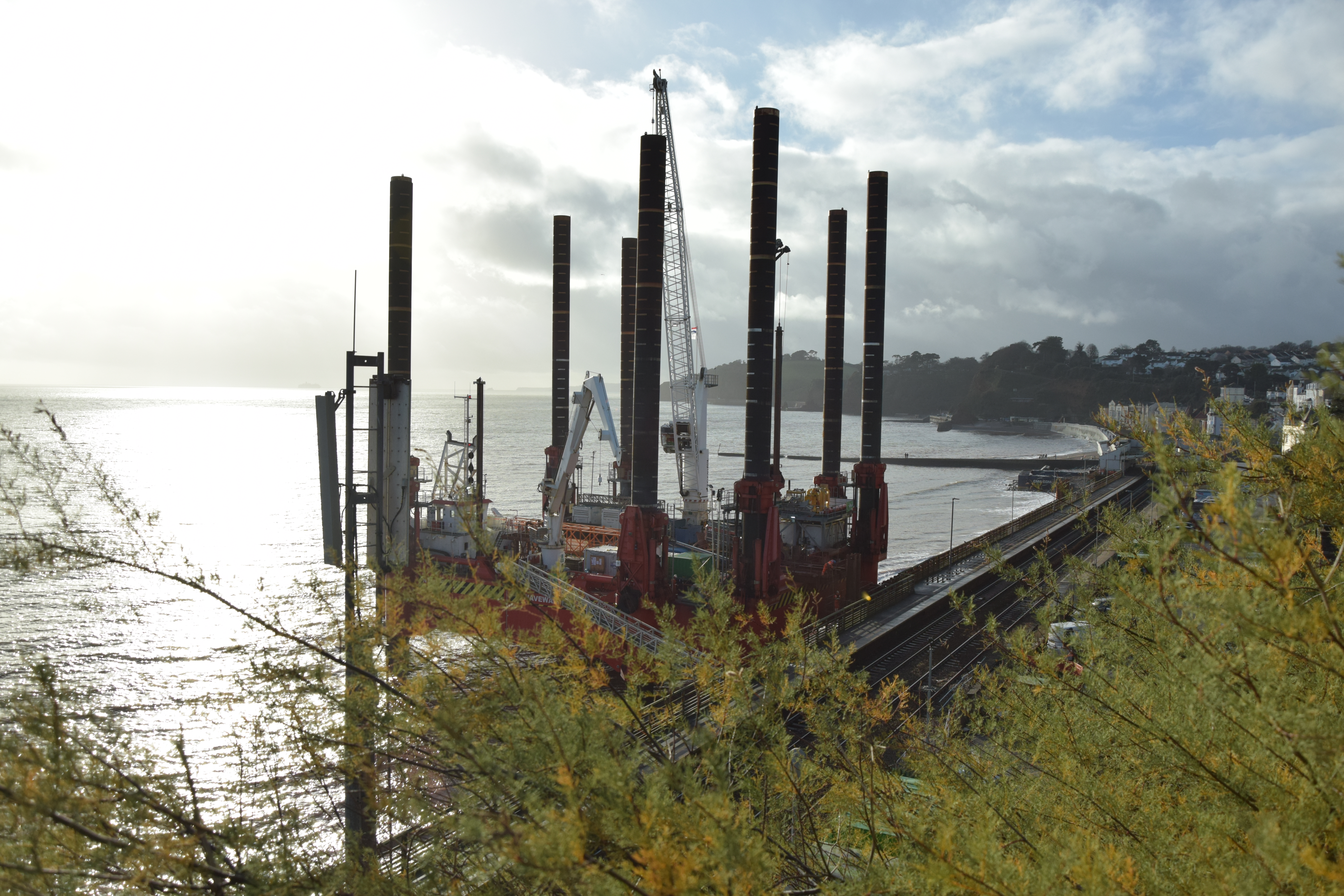 We popped over to Dawlish this morning to look at the coastal barrier that is to prevent the sea doing any more damage to the railway line the runs along beside the sea between Star Cross and Teignmouth before following the estuary to Newton Abbot. What’s so special, well the Rig being used so close to the edge of town is quite a sight, apparently the only one of its kind, so a once in a life time thing!