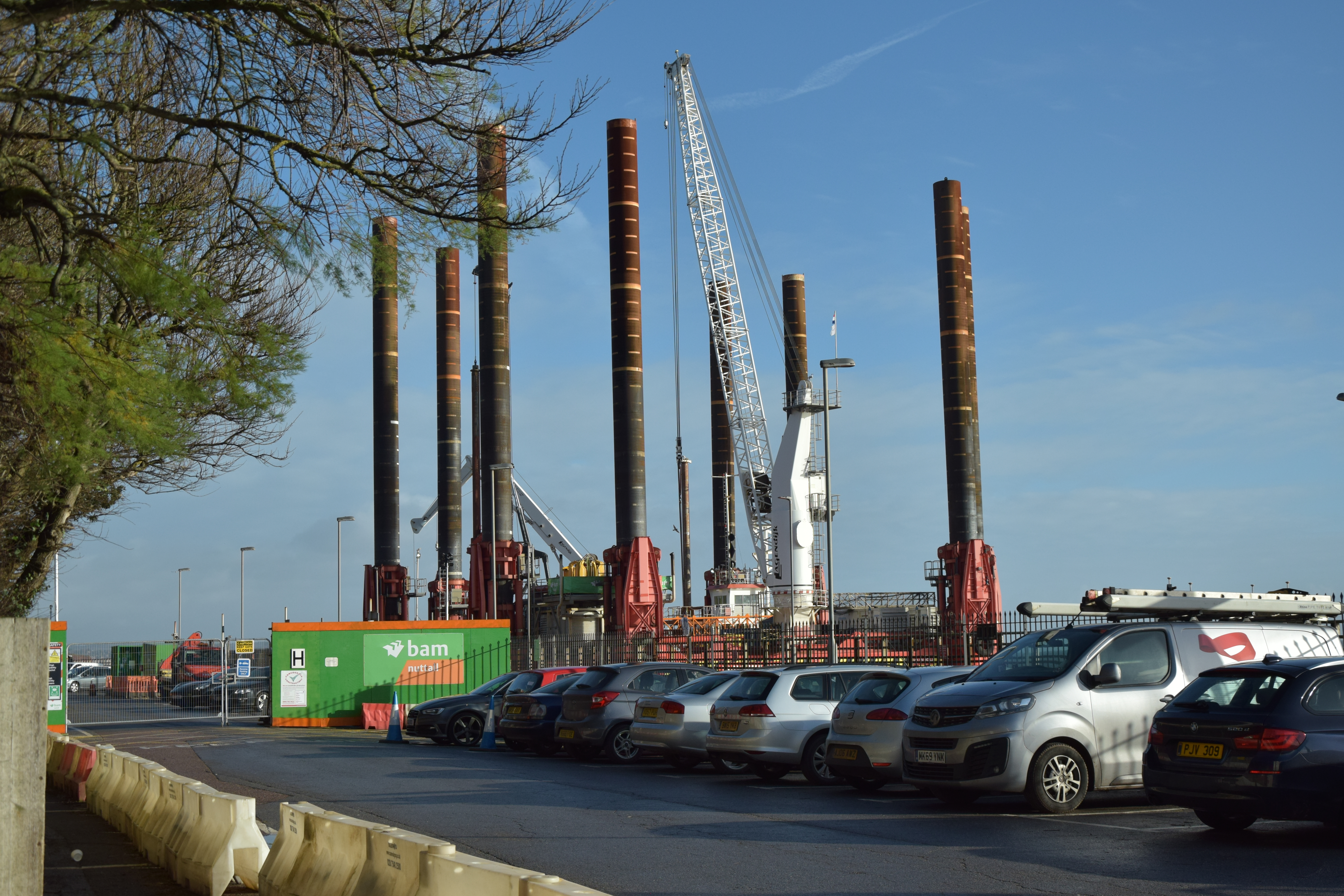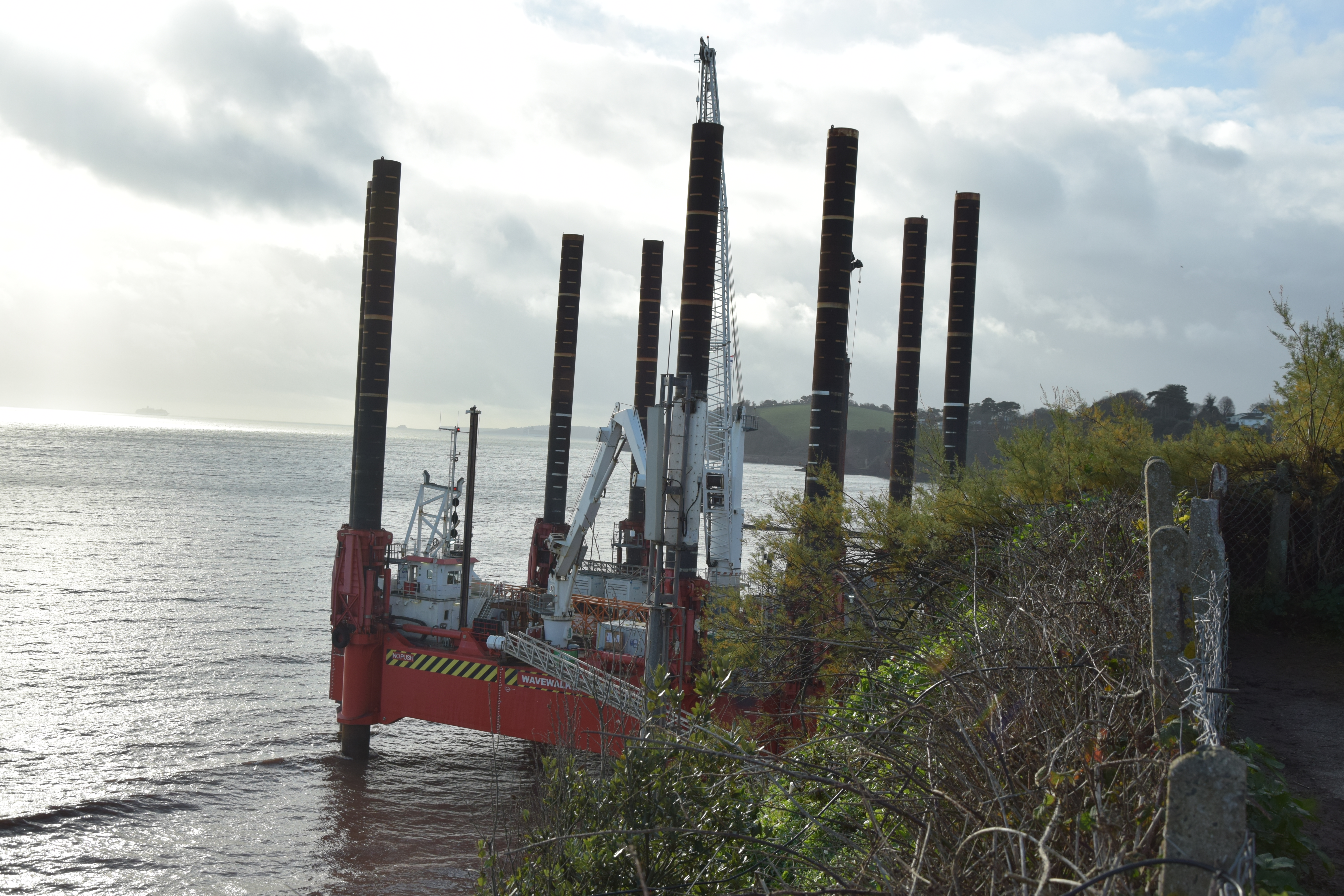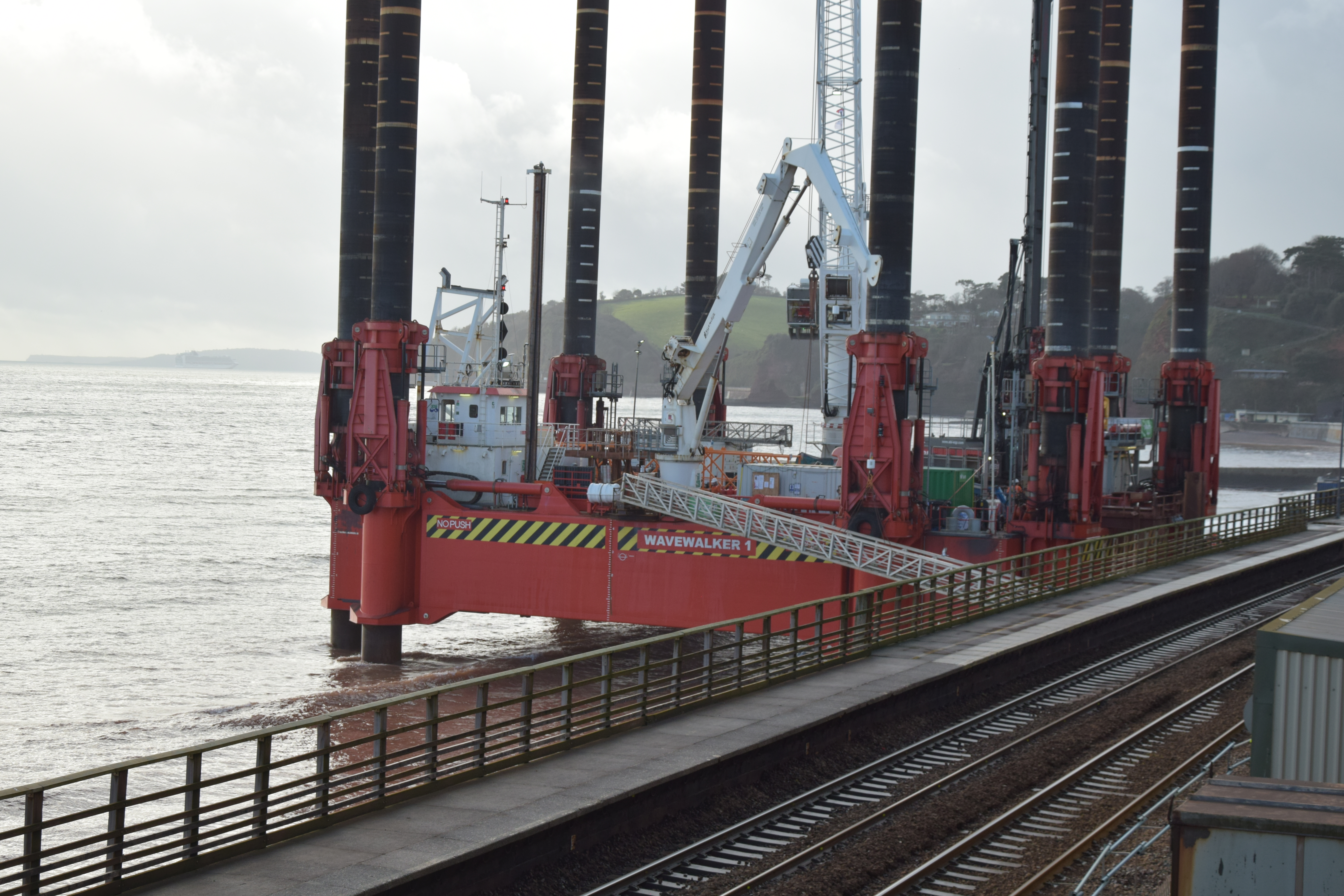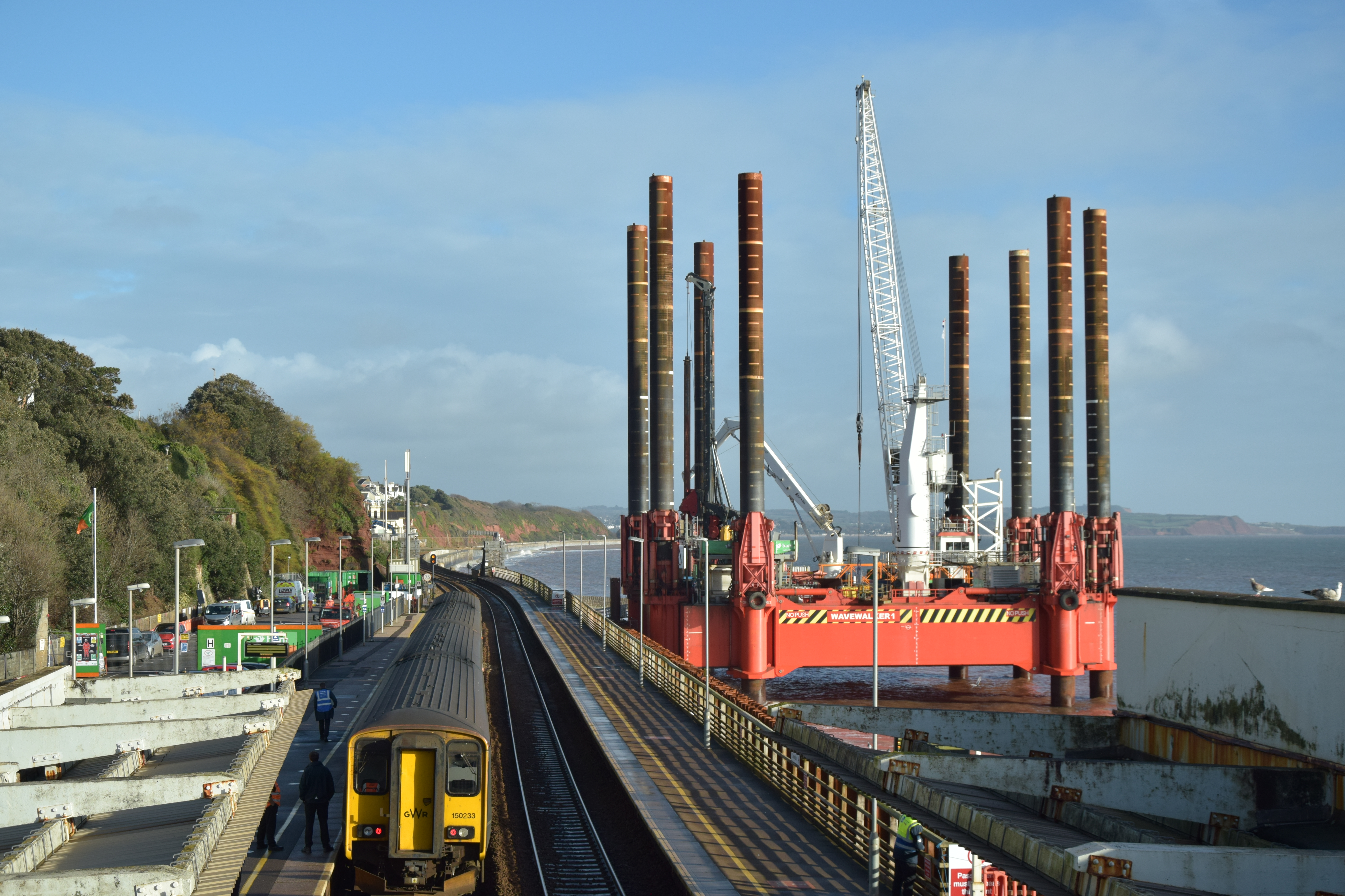 We popped over to Dawlish this morning to look at the coastal barrier that is to prevent the sea doing any more damage to the railway line the runs along beside the sea between Star Cross and Teignmouth before following the estuary to Newton Abbot. What’s so special, well the Rig being used so close to the edge of town is quite a sight, apparently the only one of its kind, so a once in a life time thing!
