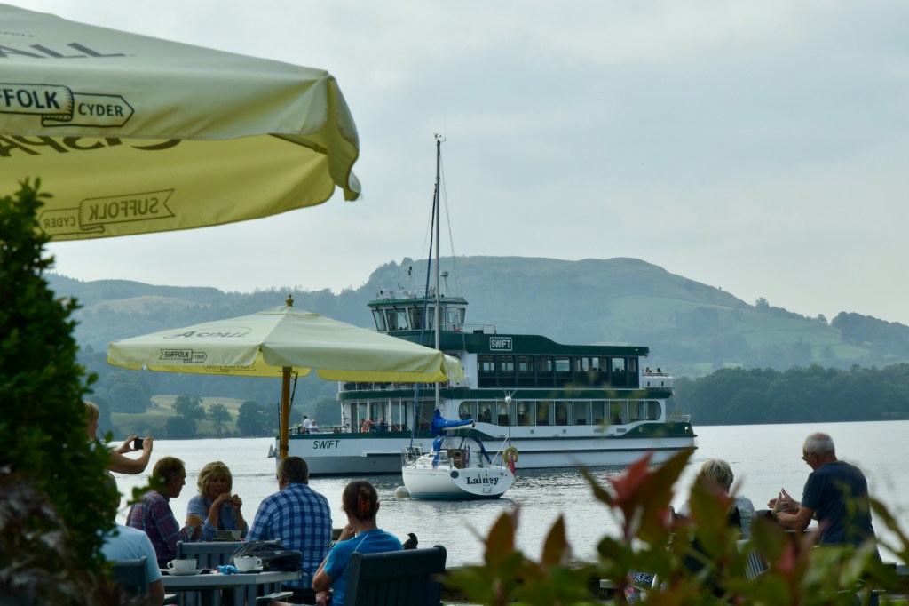 We then strolled over the road and had coffee in the garden of Wateredge Hotel, Waterhead, Ambleside LA22 0EP and just soaked up the sun watching the world and his wife go by. The lunch menu looks popular and sensibly priced as well. Soon we had to wake up to the travel plans ahead and so headed up the Kirkstone Rd towards the Kirkstone Pass at (the highest vehicle access road in the Lake District) Kirkstone Pass Inn on the A592 finally running down to Brothers Water and Ullswater stopping at Red Pit Parking area on the way down for some fabulous pictures of the scenery imaginable, mindful that the blue haze didn’t help the outcome, a camera filter might have helped!